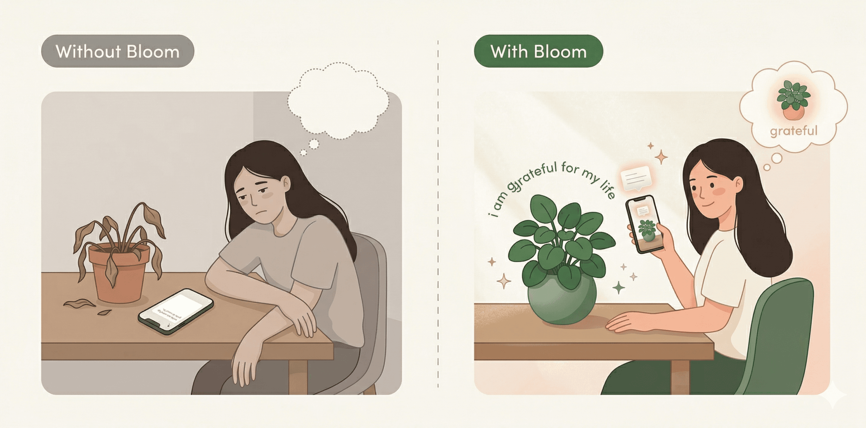The insight was simple: text disappears. A plant on your desk does not. What if gratitude had a physical presence? something you walked past every day, something that grew when you tended to it and needed you when you did not?