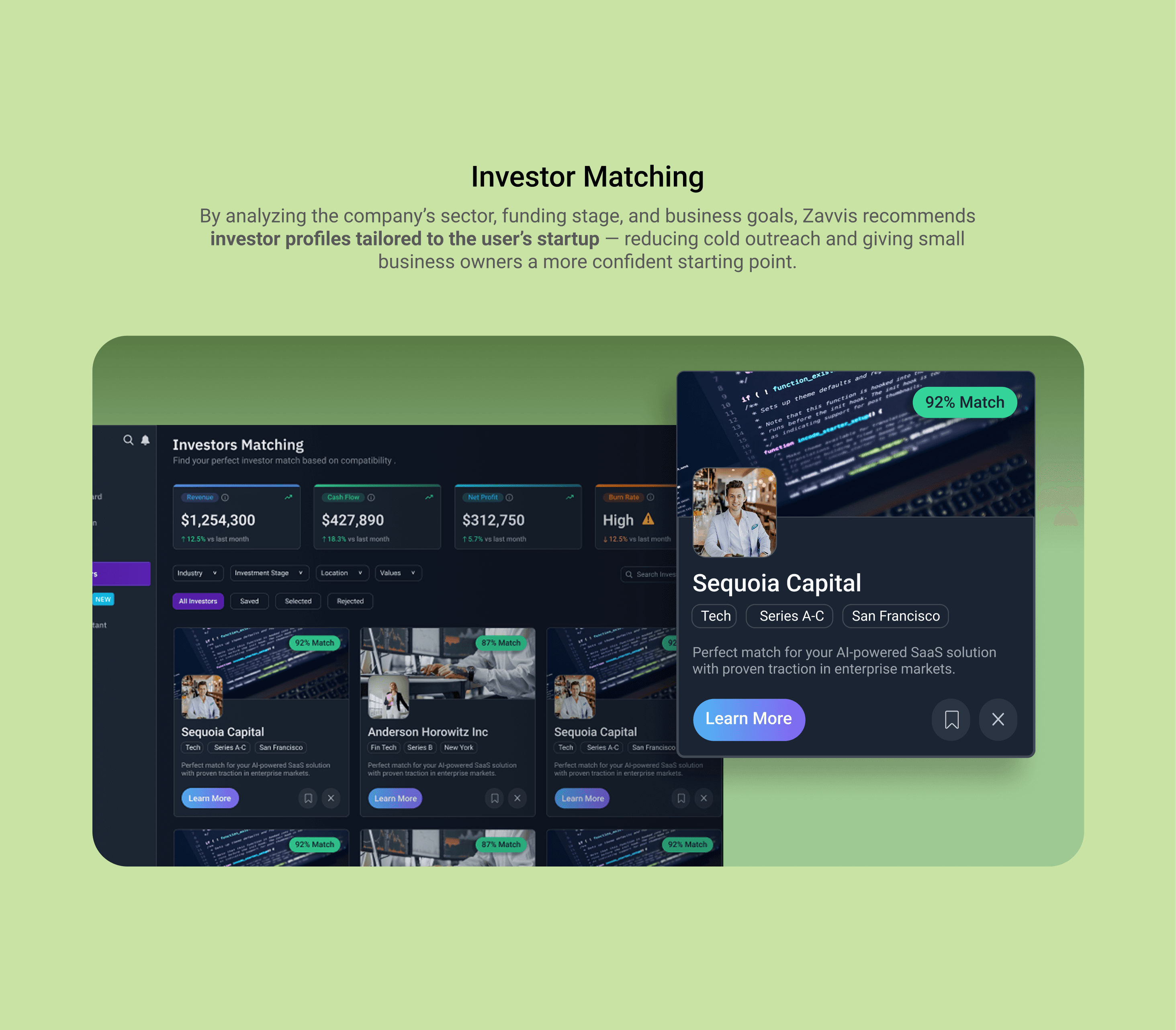 We removed the "cold outreach" friction. By mapping company data against industry benchmarks, the AI suggests specific investors (e.g., Sequoia, A16z) based on a 92% Match Score. This turned a month-long research task into a 5-minute browse.